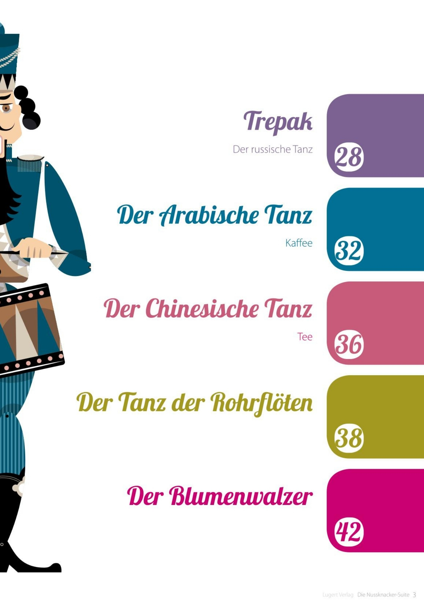 „Die „Nussknacker-Suite“, ein Auszug von Orchesterstücken aus dem gleichnamigen Ballett von Pjotr Iljitsch Tschaikowsky, ist das wahrscheinlich populärste Werk des russischen Komponisten. Der feurig-schnelle „Trepak“, aber auch die märchenhaften Klänge der Celesta im „Tanz der Zuckerfee“ sind bei Filmproduzenten äußerst beliebt und in der Fernsehwerbung omnipräsent. Der Inhalt der einzelnen Stücke sowie ihr Bezug zum Ballett und zur literarischen Märchenvorlage von E. T. A. Hoffmann werden eingehend erläutert. Jedem Satz der Suite sind sowohl erläuternde Lehrerhandreichungen als auch Arbeitsblätter mit fächerübergreifenden Unterrichts- und Lerninhalten gewidmet. Es werden die für die jeweiligen Stücke charakteristischen Instrumente vorgestellt. Hörbeispiele mit zahlreichen musikalischen Vergleichskompositionen (bis hin zu traditioneller arabischer und chinesischer Musik) schaffen ein breites musikalisches Spektrum. Musizier- und Singaufgaben regen die Schüler zu eigener musikalischer Aktivität an.“