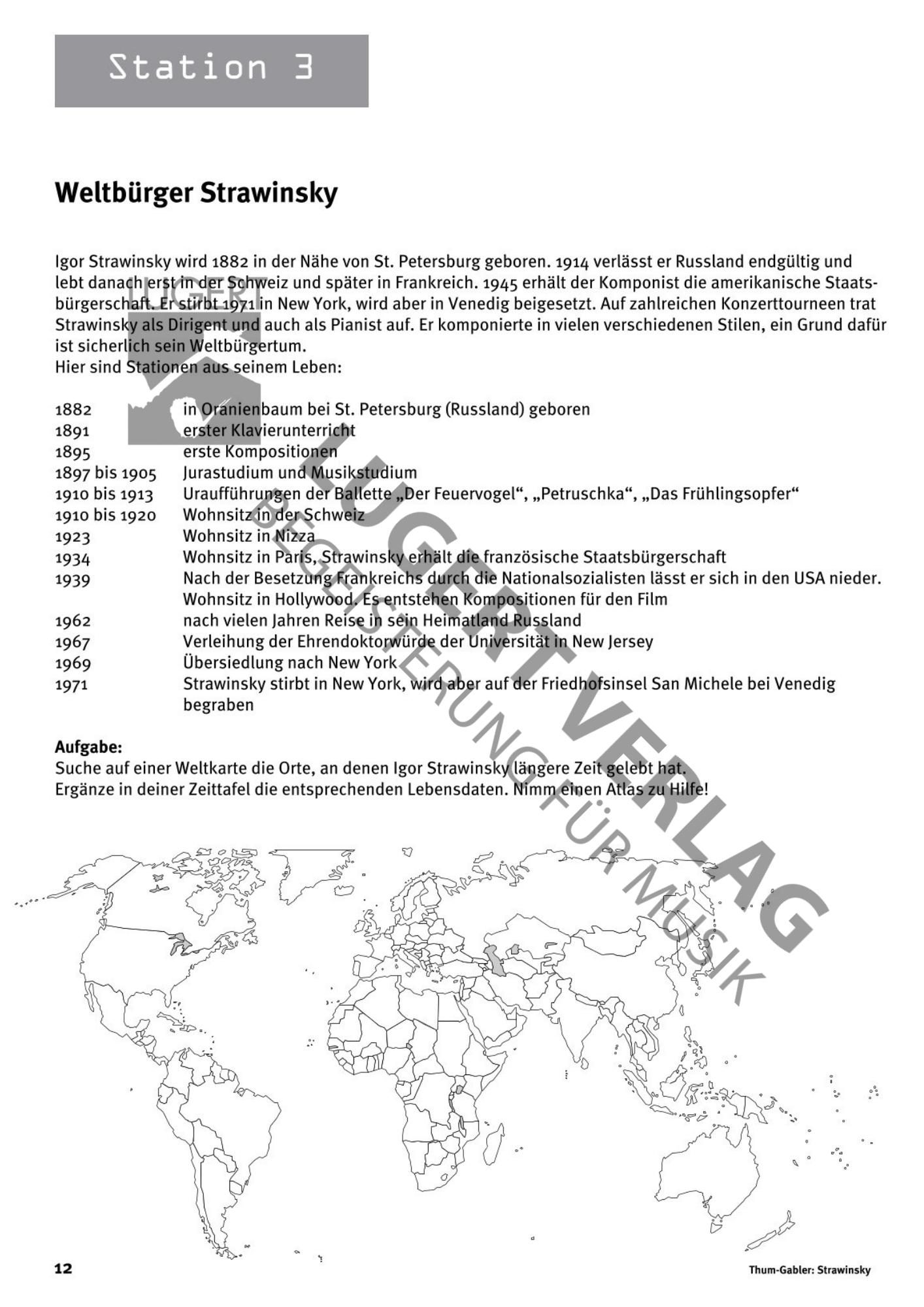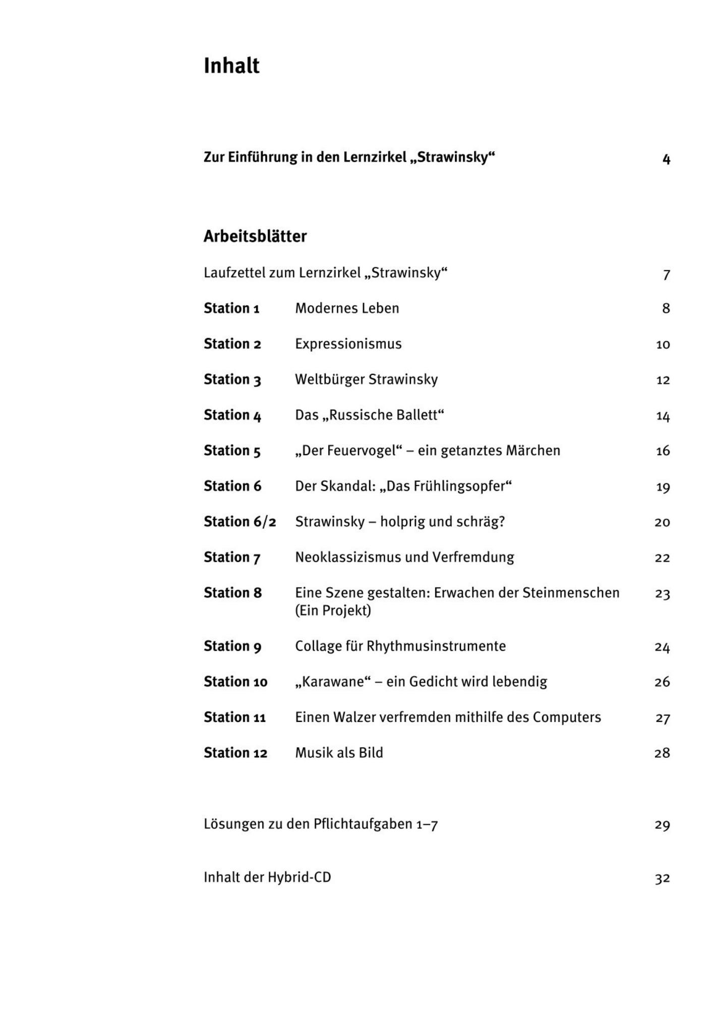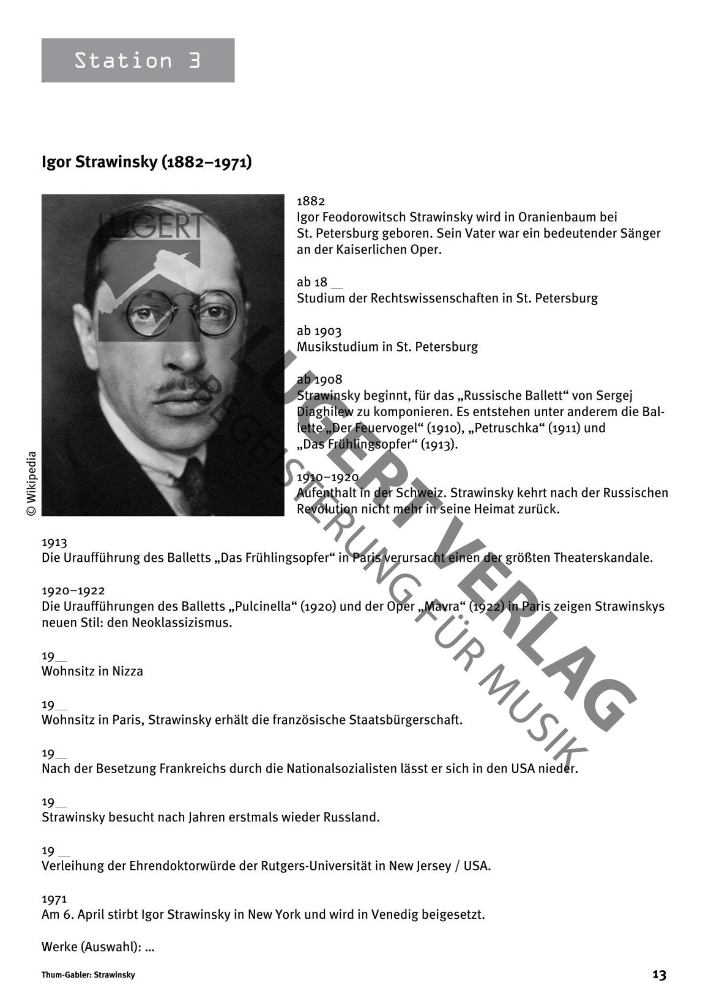 Das Arbeitsheft Strawinsky von Heidi Thum-Gabler enthält 13 Stationen, bestehend aus Pflicht- und Wahlstationen. In den Pflichtstationen wird der Künstler Strawinsky im zeitgeschichtlichen Kontext dargestellt und in den Wahlstationen können sich die Schüler praktischen Aufgaben wie dem Experimentieren mit Sprache und Bewegung und künstlerischem Gestalten widmen. Der Lernzirkel ist für die Sekundarstufe I konzipiert, einige Stationen können aber auch in höheren Klassen eingesetzt werden. Zur Durchführung werden etwa fünf Unterrichtsstunden benötigt. Zwei bis drei Pflichtstationen könnten in einer Unterrichtsstunde bearbeitet werden.