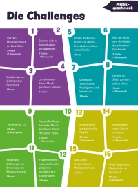 Mit diesen 16 Challenges können Sie Ihren Schüler*innen das Thema Musikgeschmack näher bringen – humorvoll, informativ und kreativ. Greifen Sie auf den reichhaltigen Pool an Ideen zurück, um Ihren Schüler*innen spannende Einstiege und Abschlüsse zu Lehrplaninhalten anzubieten oder nutzen Sie die verschiedenen Spielvarianten, um bunten, informativen und lockeren Unterricht mit zahlreichen Gesprächsanlässen und Präsentationen zu gestalten.