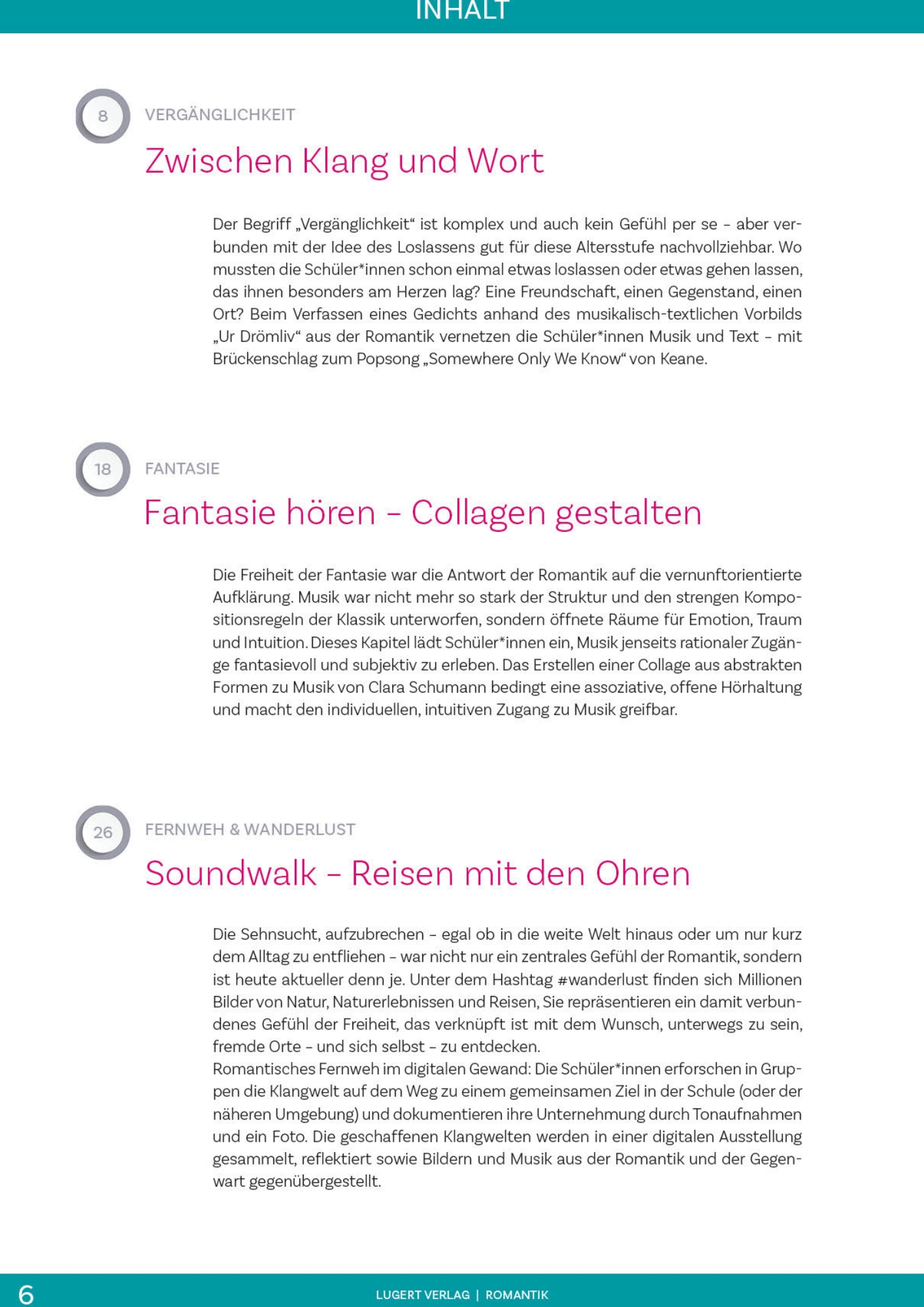 Jede der sechs unabhängig einsetzbaren Einheiten kreist um ein Gefühl oder Motiv, das in der Romantik ebenso bedeutend war wie in der heutigen Lebenswelt: