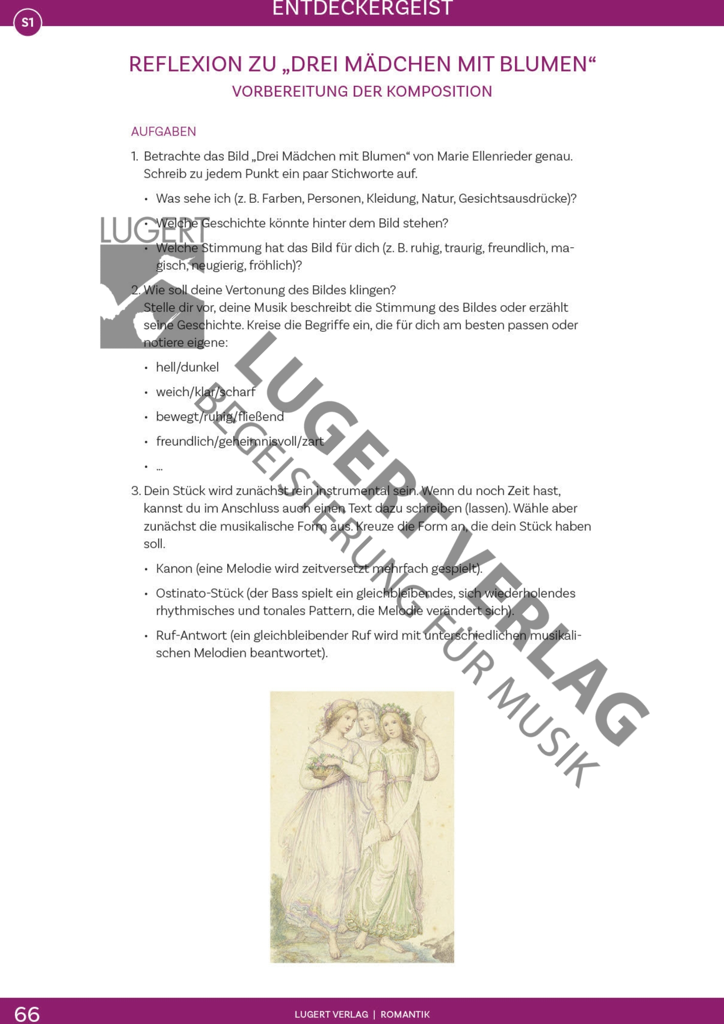 Die Freiheit der Fantasie war die Antwort der Romantik auf die vernunftorientierte Aufklärung. Musik war nicht mehr so stark der Struktur und den strengen Kompositionsregeln der Klassik unterworfen, sondern öffnete Räume für Emotion, Traum und Intuition. Dieses Kapitel lädt Schüler*innen ein, Musik jenseits rationaler Zugänge fantasievoll und subjektiv zu erleben. Das Erstellen einer Collage aus abstrakten Formen zu Musik von Clara Schumann bedingt eine assoziative, offene Hörhaltung und macht den individuellen, intuitiven Zugang zu Musik greifbar.