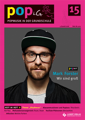 „POPi.G. – Popmusik in der Grundschule 15“ steckt zum Schuljahresbeginn voller sommerlicher Ideen für einen gelungenen Wiedereinstieg in die Schule. Ob mit den EM-Songs des Sommers, dem YouTube-Phänomen „Die Lochis“ oder den vielen anderen Liedern aus dem Heft – so gelingt der richtige Start ins neue Schuljahr! Das Topthema dieser Ausgabe ist der Song „Wir sind groß“ von Mark Forster und ist wie für die Grundschule gemacht: Der Liedtext handelt von der positiven Grundstimmung junger Leute und dem Großwerden.