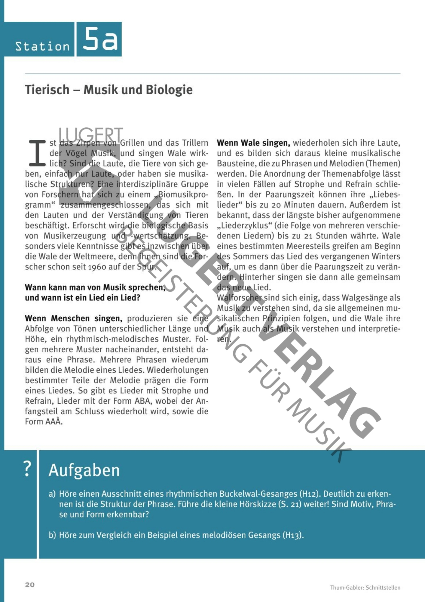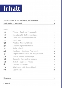 Der Lernzirkel „Schnittstellen“ bewegt sich an den Grenzen zwischen Musik und den wissenschaftlichen Disziplinen Psychologie, Physik, Mathematik, Biologie und Kunst und kann als Impulsgeber für tiefere Zusammenarbeit mit den Fächern dienen. Darüber hinaus widmet es sich speziellem Grundwissen oder fordert kompetenzorientiertes Arbeiten am Notentext und im Umgang mit Software. Es überrascht mit ebenso unkonventionellen wie spannenden Fragen: Was haben der Buckelwal und die Tacoma Narrows Bridge mit Musik zu tun, und wie kann es sein, dass eine Tonleiter niemals ankommt? Was braucht man, um ein Virtuose wie David Garrett zu werden? Antworten auf diese Fragen finden Sie im Heft.