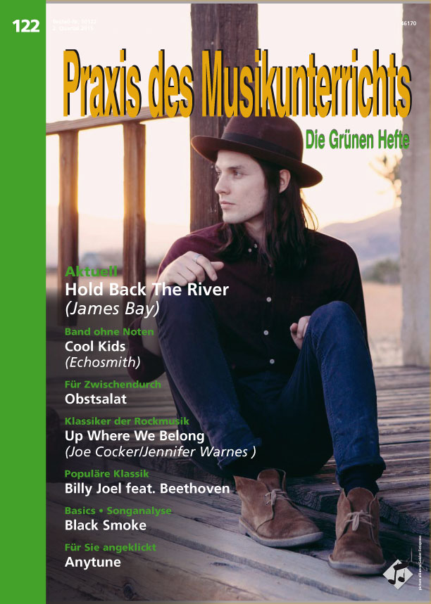 Der Musiker James Bay gehört zu den Künstlern, denen man bereits im letzten Jahr eine erfolgreiche Karriere prognostiziert hat. Mit dem Song „Hold Back The River“ ist ihm in diesem Jahr der Durchbruch gelungen. Der Song „Cool Kids“ von Echosmith behandelt ein ernsthaftes Thema, nämlich dass der Ausgrenzung, und wird in der Rubrik „Band ohne Noten“ für den Unterricht angeboten. Mit dem Arrangement Obstsalat befindet sich im Heft ein kleines Stück, das gut als Warm-up für die ganze Klasse geeignet ist.