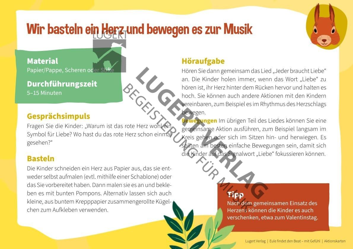 Auf den Aktionskarten werden alle Ideen vorgestellt: Mit dem Murmeltier basteln die Kinder einen Angstfänger, der Dachs lädt zur mutigen Bodypercussion ein und die Haselmaus freut sich, mit den Kindern zu tanzen und zu musizieren. Jedes Tier steht für ein Gefühl und dazu gibt es jeweils vier bis fünf Aktionen. Zusätzlich werden zum Thema Gefühle im Allgemeinen vier Umsetzungsideen vorgestellt. Nach und nach sind die Kinder mit den Aktionen vertraut und können auch die Gefühle zuordnen. Die Zusammengehörigkeit von Tier und Gefühl hilft den Kindern dabei, sich besser zu orientieren.