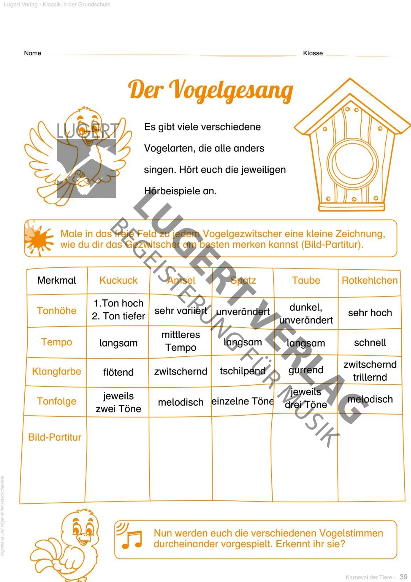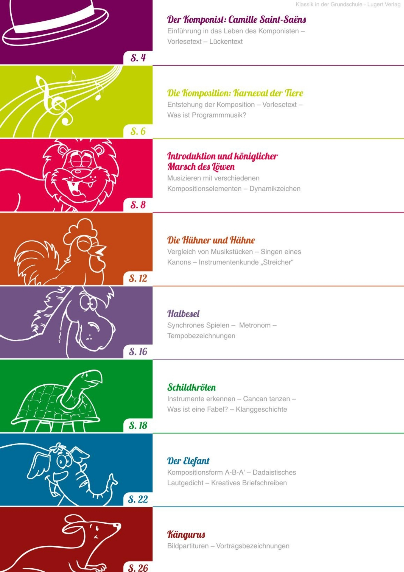 „Im Heft entdecken Sie auf den Lehrerseiten die Inhalte und Zusammenhänge der einzelnen Tierkompositionen. Jedes Kapitel gibt Ihnen eine Idee für einen gelungenen Unterrichtseinstieg in den Teil der Komposition. Was in der Musik im Detail passiert, wird in der Rubrik „Hören“ so beschrieben, dass es für Kinder leicht nachvollziehbar ist. Anregungen zur eigenen musikalischen Umsetzung und Gestaltung sind ebenfalls in jedem Kapitel enthalten. Die meisten Ideen zu den Tierkompositionen sind in ein bis zwei Schulstunden umsetzbar. Passende Arbeitsblätter erleichtern Ihnen die Arbeit im Schulalltag. Dabei wird auf die zu hörenden Instrumente ebenso eingegangen, wie musikalisches Wissen für Kinder mit und ohne musikalische Vorbildung vermittelt wird. Unterschiedliche Instrumente werden mit Bezug auf die Stücke des „Karnevals der Tiere“ näher betrachtet.“