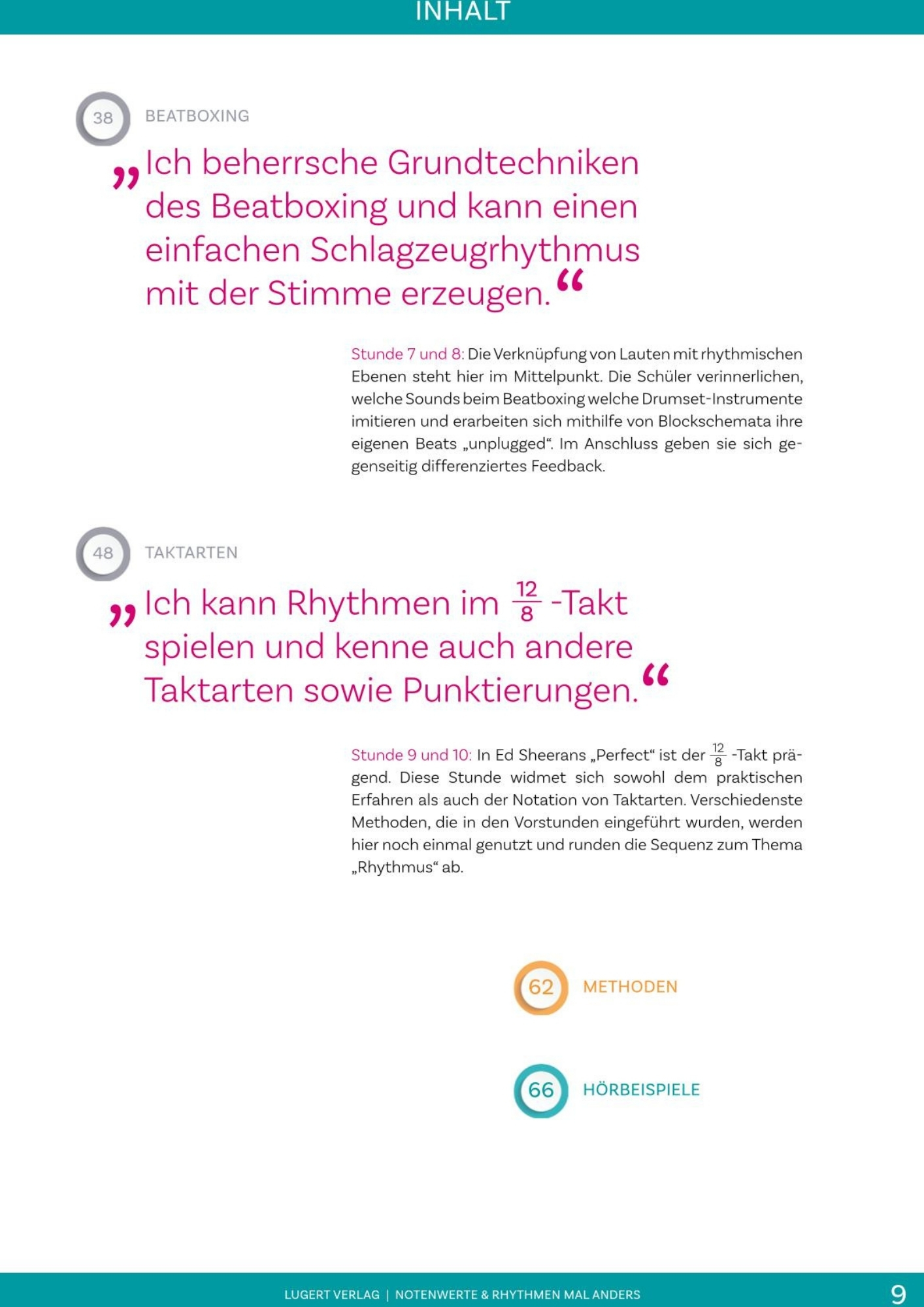 In Ed Sheerans „Perfect“ ist der 12/8 -Takt prägend. Diese Stunde widmet sich sowohl dem praktischen Erfahren als auch der Notation von Taktarten. Verschiedenste Methoden, die in den Vorstunden eingeführt wurden, werden hier noch einmal genutzt und runden die Sequenz zum Thema „Rhythmus“ ab.