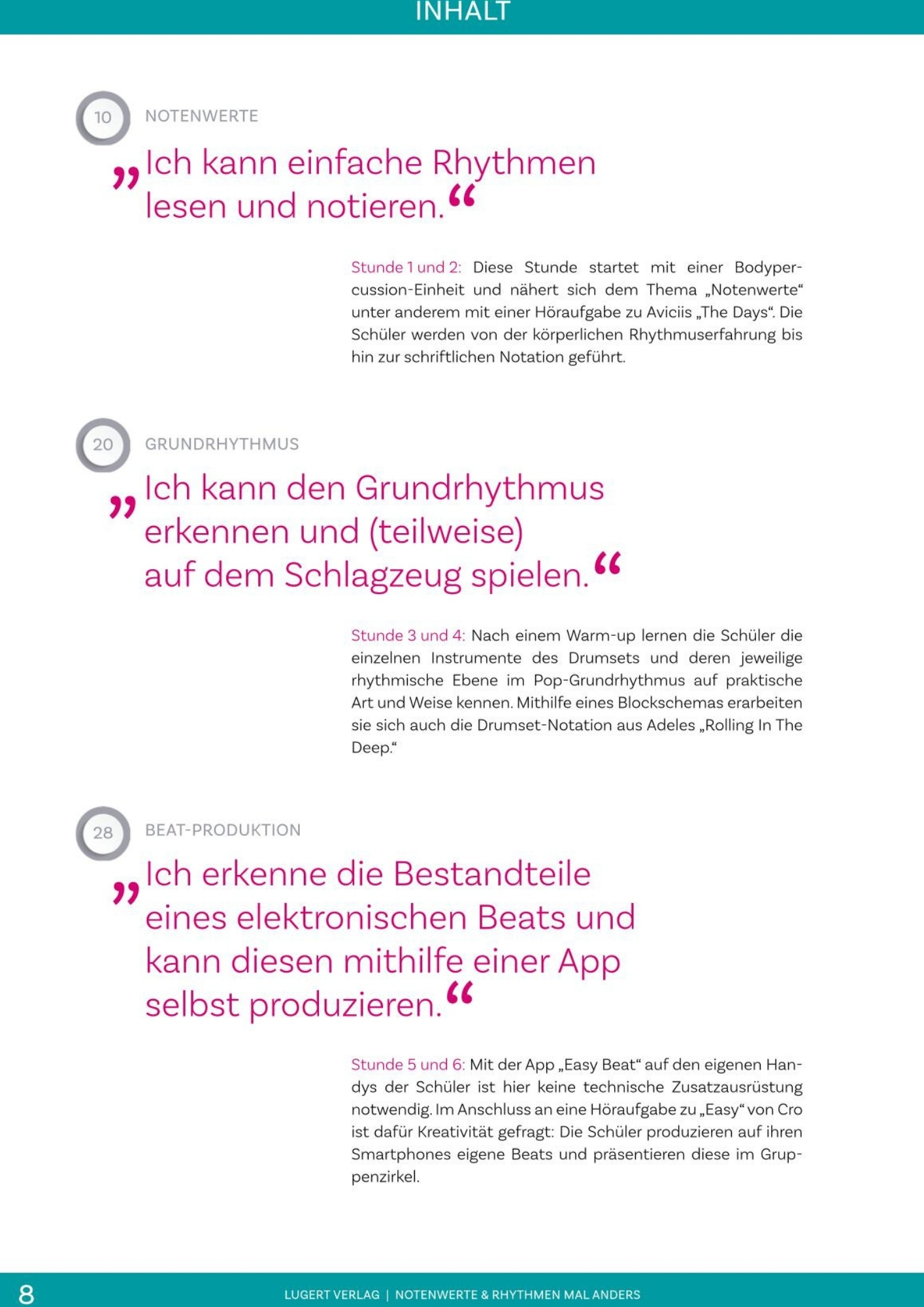 Mit Popmusik kann es gelingen selbst vermeintlich trockene Lehrplanthemen schülernah zu unterrichten. Der Autor dieses Heftes stellt praxisnah und direkt umsetzbar vor, wie es klappt. Die Themen „Notenwerte und Rhythmen“ werden mit transparenten Unterrichtszielen vorgestellt und mit viel Musikpraxis und neuen Ideen vermittelt. Schwerpunkt ist ein Methodenmix der erfahrungsbezogen und ausgehend von der Praxis jeden Schüler mitnimmt.