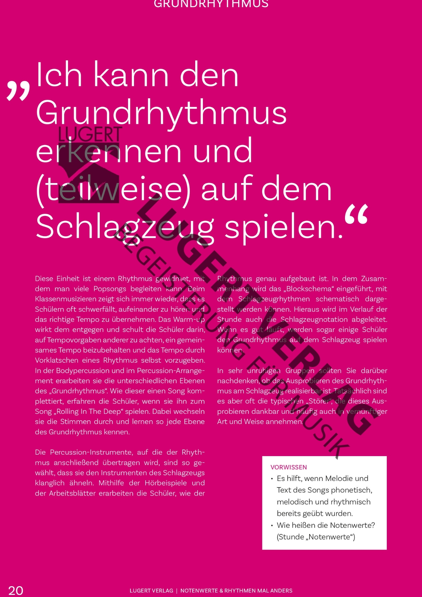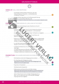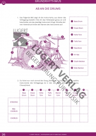 Nach einem Warm-up lernen die Schüler die einzelnen Instrumente des Drumsets und deren jeweilige rhythmische Ebene im Pop-Grundrhythmus auf praktische Art und Weise kennen. Mithilfe eines Blockschemas erarbeiten sie sich auch die Drumset-Notation aus Adeles „Rolling In The Deep.“
