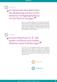 Die Verknüpfung von Lauten mit rhythmischen Ebenen steht hier im Mittelpunkt. Die Schüler verinnerlichen, welche Sounds beim Beatboxing welche Drumset-Instrumente imitieren und erarbeiten sich mithilfe von Blockschemata ihre eigenen Beats „unplugged“. Im Anschluss geben sie sich gegenseitig differenziertes Feedback.