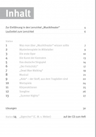 Auf 32 Seiten reicht das Heft von Heidi Thum-Gabler thematisch von den Mysterienspielen des Mittelalters und der ersten Oper über die Kunst der Kastraten, das deutsche Singspiel und die romantische Oper bis hin zum Musical und aktueller amerikanischer Musik. Die 13 Stationen bieten wie gewohnt eine große methodische Vielfalt vom allgemeinen Quiz bis hin zu analytischen Aufgaben. Die Wahlpflichtstationen sind betont praktisch ausgerichtet und machen Schüler der Sekundarstufe spielerisch vertraut mit den drei Säulen des Musiktheaters: Sprache, Bewegung und Gesang.