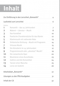 Das Heft „Romantik“ bietet einen gangbaren Mittelweg und vielfältige Methoden zur Lösung der Aufgaben über Höranalyse, Lückentexte, Zuordnen von Bildern und Arbeiten mit Notenmaterial. Selbstverständlich finden Sie in diesem Heft – wie in allen anderen Heften der Reihe auch – Stationen zum gemeinsamen Musizieren, Singen, Tanzen und Rezitieren, die sich auf die Thematik des theoretischen Teils beziehen. Jede Station ist eine in sich abgeschlossene Einheit, sodass mit jeder begonnen werden kann. Aus dem großen Zirkel lassen sich problemlos kleine Zirkel je nach Unterrichtskonzeption zusammenstellen. Das Material ist auch für den Frontalunterricht verwendbar.