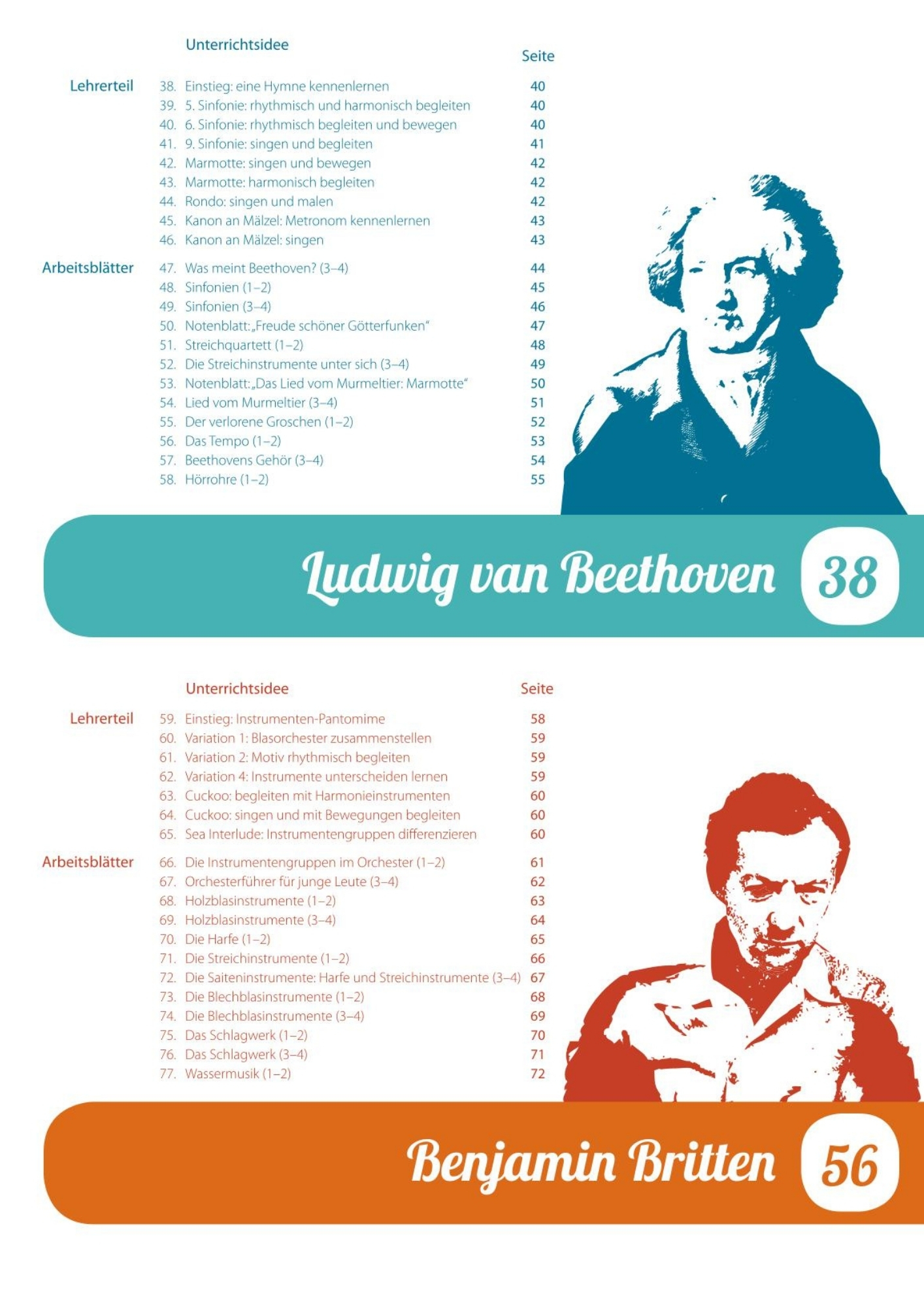 Klassische Komponisten sind alt und verstaubt? Es geht auch anders! Mit unserem Unterrichtsmaterial lernen die Schüler Bach, Mozart, Beethoven und Britten aktiv kennen – sie hören klassische Musik verschiedener Epochen, singen und musizieren zu berühmten Werken und nähern sich spielerisch den wichtigsten Lebensphasen der Komponisten.