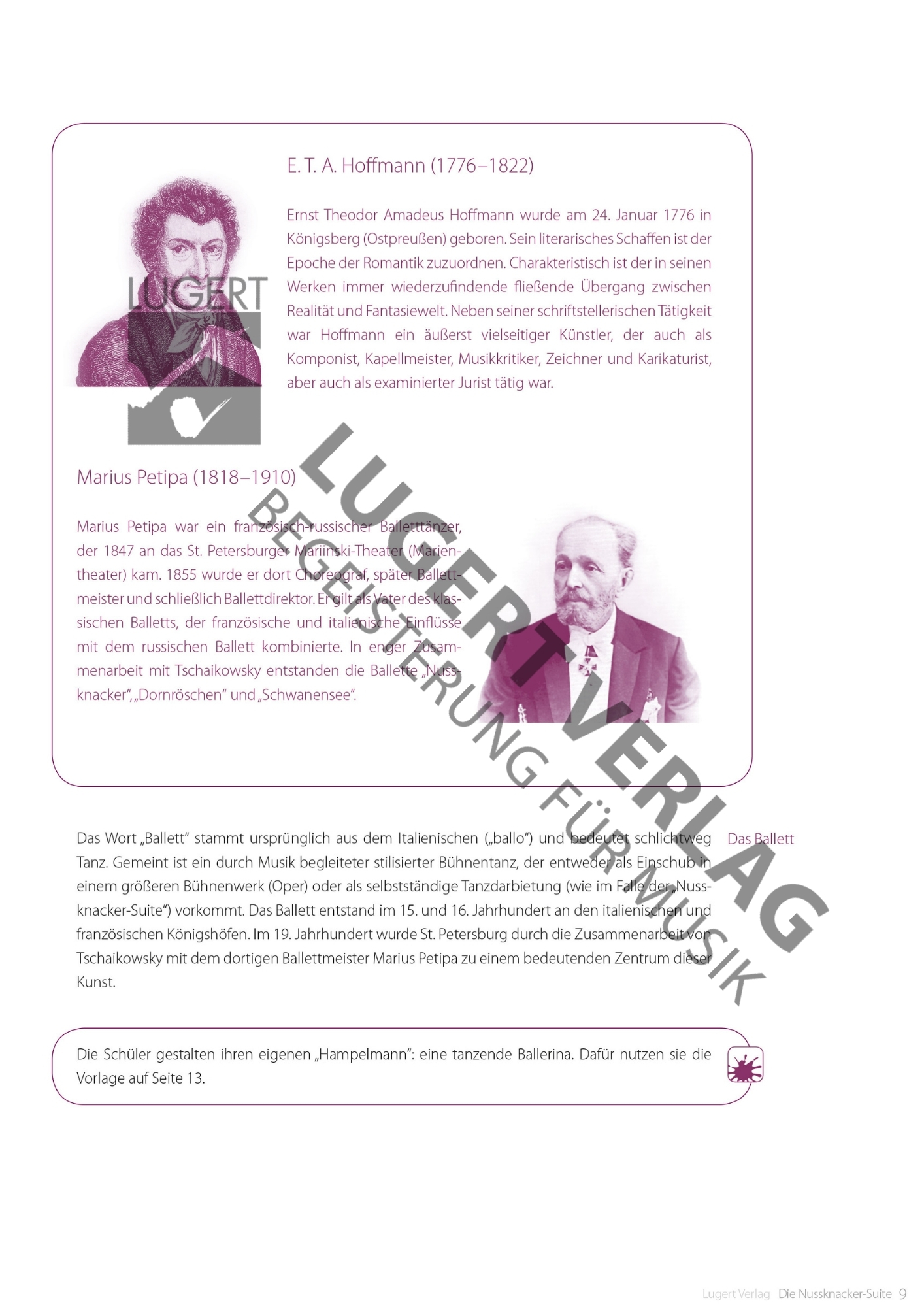 Woher stammt die literarische Vorlage des „Nussknackers“? Wie definiert man Ballett? Und was hat der „Arabische Tanz“ eigentlich mit Kaffee zu tun? Die Arbeitsblätter enthalten Bastel- und Malvorlagen sowie Schreib-, Hör-, Bewegungs- und Musizieraufgaben: Die Schüler begleiten die Ouvertüre mit der Triangel, gestalten ihre eigene Hampelmann-Ballerina, schreiben eine eigene Weihnachtsgeschichte oder bewegen sich zum 4/4-Takt des Marsches.