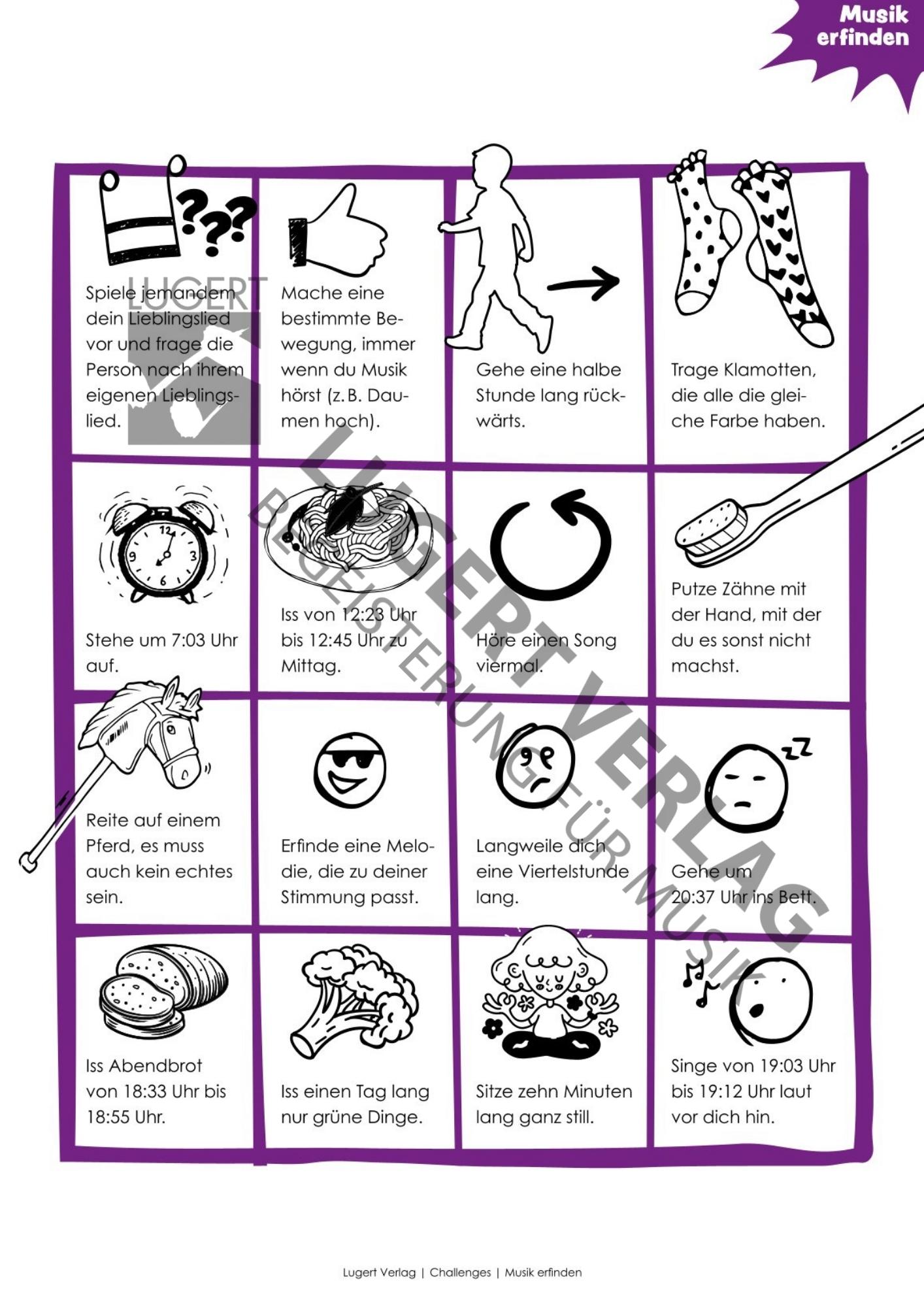 Mit diesem digitalen Unterrichtsmaterial erhalten Sie 9 Challenges zum Thema „Musik erfinden“: Fordern Sie Ihre Schülerinnen und Schüler auf, einen Tag wie der Komponist Erik Satie zu verbringen, ein eigenes Instrument zu erfinden, ein bekanntes Lied mit einer neuen Melodie zu versehen oder sich einen möglichst langen Gesang auf Silben auszudenken – ohne dass sich eine Silbe wiederholt. Sie werden jede Menge Spaß haben und durch diese unkonventionelle Art zu unterrichten viele Lernerfolge erzielen.