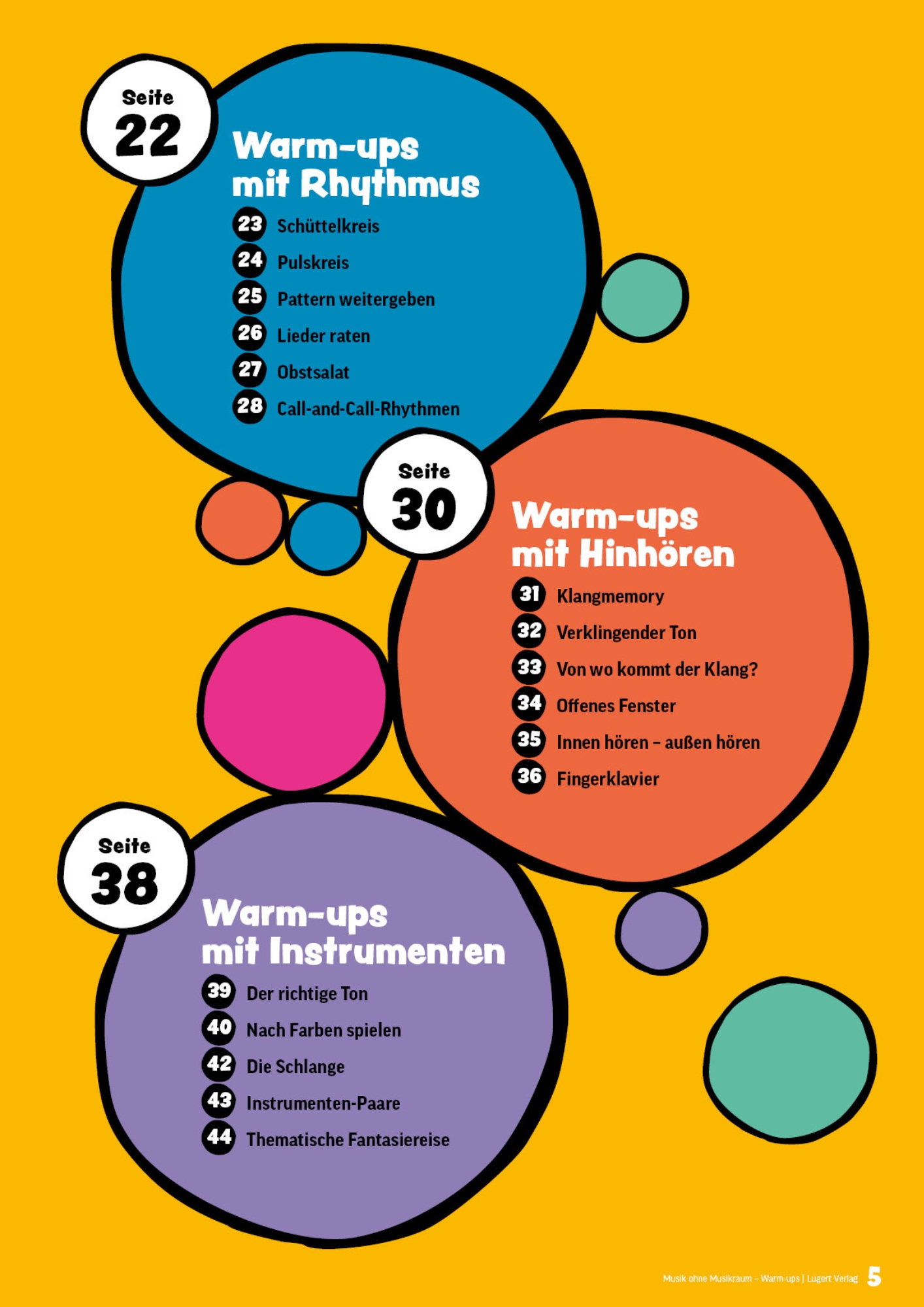 Die musikalischen Übungen lassen sich spontan und ohne viel Einlesen in den Unterricht integrieren. Sie sind in die Kapitel „Bewegung“, „Stimme“, „Rhythmus“, „Hören“ und „Instrument“ aufgeteilt. Die Warm-ups sind vielseitig und in allen Klassen der Grundschule einsetzbar, da sie sehr einfach im Schwierigkeitsgrad differenzierbar oder thematisch anpassbar sind. Die Spielideen wirken sich positiv auf eine wertschätzende und gut gelaunte Lernumgebung aus. Sie unterstützen dadurch eine positive Bindung zwischen Lehrkraft und Klasse sowie innerhalb der Gruppe.