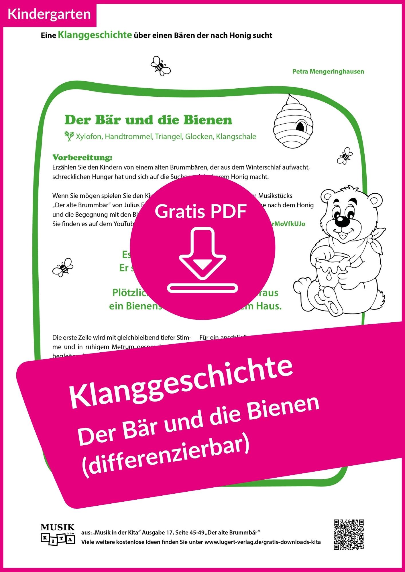 Mit diesem Gratis-Download schenken wir Ihnen eine kleine Klanggeschichte über einen Bären, der nach Honig sucht und über die Bienen, die „mit Saus und Braus aus ihrem Haus“ kommen. Sie erhalten Ideen, wie die Vorschulkinder die Geschichte mit Xylofon, Handtrommel, Triangel, Glocken und Klangschale begleiten und wie einzelne den Einsatz und das Tempo der Gruppe dirigieren können. Diese Klanggeschichte stammt aus der Musik in der Kita-Ausgabe 17 und ist für Sie auf einer Seite PDF kostenlos für Sie aufbereitet.