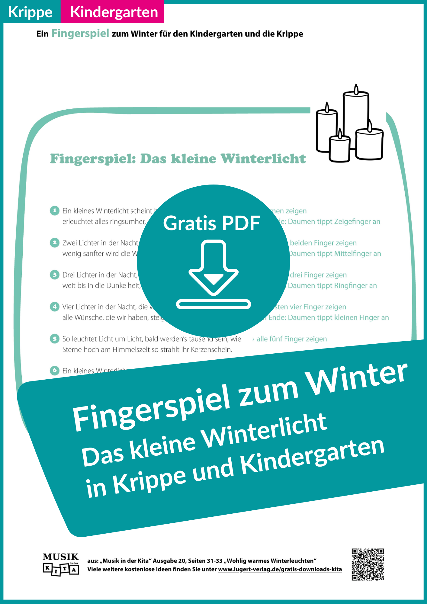 Mit einem winterlichen Fingerspiel lernen die Kinder ihre Hände und Finger zu gebrauchen. Sie bewegen jeden einzelnen Finger und bemerken Unterschiede in der Mobilität. Sie berühren mit dem Daumen die anderen Finger und spüren nach. Das alles auszuprobieren macht Spaß und fördert ganz nebenbei die Geschicklichkeit und die Hand-Auge-Koordination. Mit dem Fingerspiel „Das kleine Winterlicht“ bringen Sie eine warmig-wohlige Atmosphäre in die Gruppe.