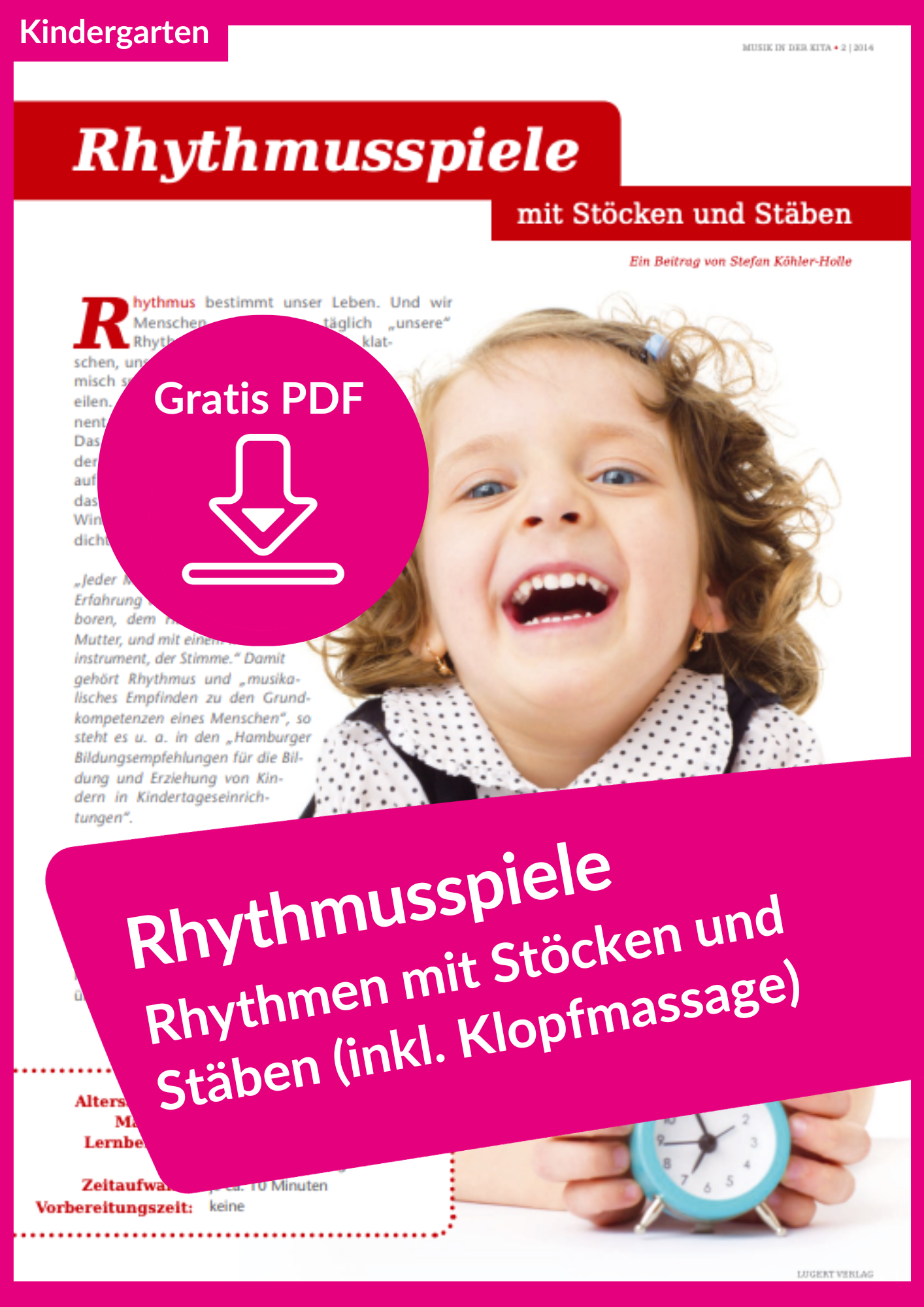 Mit diesem 5-seitigen PDF erhalten Sie Ideen zur Förderung von Rhythmusgefühl und Motorik. Starten Sie mit einfachen kleinen Übungen, in denen die Kinder zunächst erfahren, was Rhythmus überhaupt ist: Eine Regentropfen-Klopfmassage inklusive Begleit-Geschichte und ein Warm-Up-Spiel, um die Kinder mit den Gymnastikstöcken vertraut zu machen. Die Rhythmusübungen mit den Gymnastikstäben reichen dann vom gemeinsamen Rhythmuskreis, einem Kreisspiel mit Rhythmen, in dem die Kinder auch kreativ eigene einfache Rhythmen erfinden können, bis zu einem Reaktionsfähigkeits-Spiel und einer gruppendynamischen Übung. Freuen Sie sich darüber hinaus auf ein bewegtes Schreitspiel („Hexe, Hexe, was kochst du heute?“), das die Sprache mit dem Klang und Rhythmus der Stöcke verbindet. Außerdem im Beitrag enthalten: Ein Uhrenspiel mit Stöcken (inklusive Gedicht) sowie weitere Rhythmusideen mit Stöcken und Bällen, bei denen die Kinder aktiv mit Rhythmen experimentieren können.
