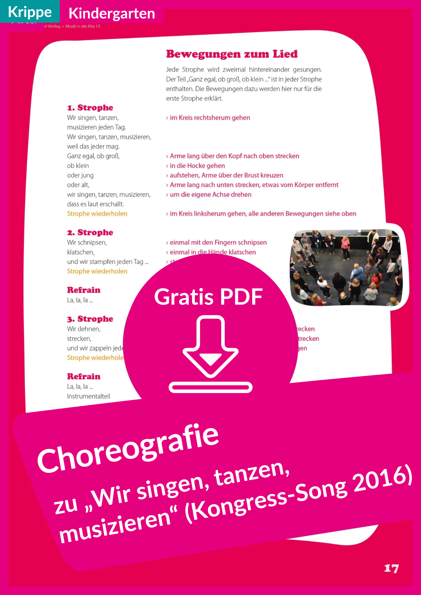 „Wir singen, tanzen, musizieren“ ist der erfolgreiche Kongress-Song von unseren „Musik in der Kita“-Herausgeberinnen Elke Gulden und Bettina Scheer. Holen Sie die Choreografie zu „Wir singen, tanzen, musizieren“ jetzt in Ihren Kindergarten! Mit dem Gratis-Download bekommen Sie die Erläuterungen zu den Bewegungen. Diese sind leicht abgewandelt und stimmen nicht immer genau mit den Bewegungen im Tanz-Video überein: