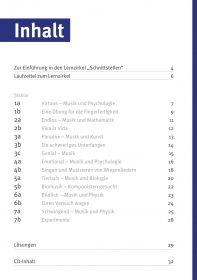 Der Lernzirkel „Schnittstellen“ bewegt sich an den Grenzen zwischen Musik und den wissenschaftlichen Disziplinen Psychologie, Physik, Mathematik, Biologie und Kunst und kann als Impulsgeber für tiefere Zusammenarbeit mit den Fächern dienen. Darüber hinaus widmet es sich speziellem Grundwissen oder fordert kompetenzorientiertes Arbeiten am Notentext und im Umgang mit Software. Es überrascht mit ebenso unkonventionellen wie spannenden Fragen: Was haben der Buckelwal und die Tacoma Narrows Bridge mit Musik zu tun, und wie kann es sein, dass eine Tonleiter niemals ankommt? Was braucht man, um ein Virtuose wie David Garrett zu werden? Antworten auf diese Fragen finden Sie im Heft.