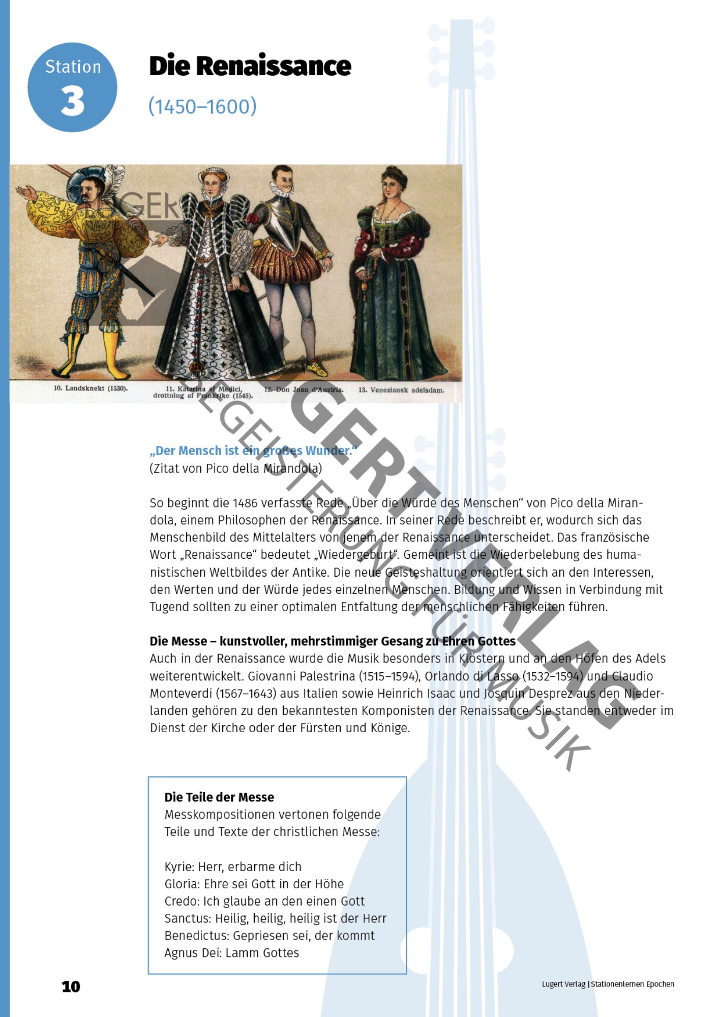 Vom Minnesang über venezianische Mehrchörigkeit bis hin zu elektronischer Musik und Soundscapes des 21. Jahrhunderts: Der Lernzirkel vermittelt Basiswissen zu musikalischen Gattungen und deren gesellschaftlichen Hintergründen. Die Stationen beginnen mit kurzen Einführungstexten, die bedeutende Persönlichkeiten der jeweiligen Epoche vorstellen, auf politische und gesellschaftliche Entwicklungen eingehen und den Schüler*innen so ermöglichen, die Gegebenheiten in der Epoche nachzuvollziehen. Darauf folgen Aufgaben, die das analytische Hören fördern und die oft durch praktische Aktivitäten ergänzt werden – z. B. Singen, Instrumentalspiel, szenische Darstellung oder multimediale Projekte.