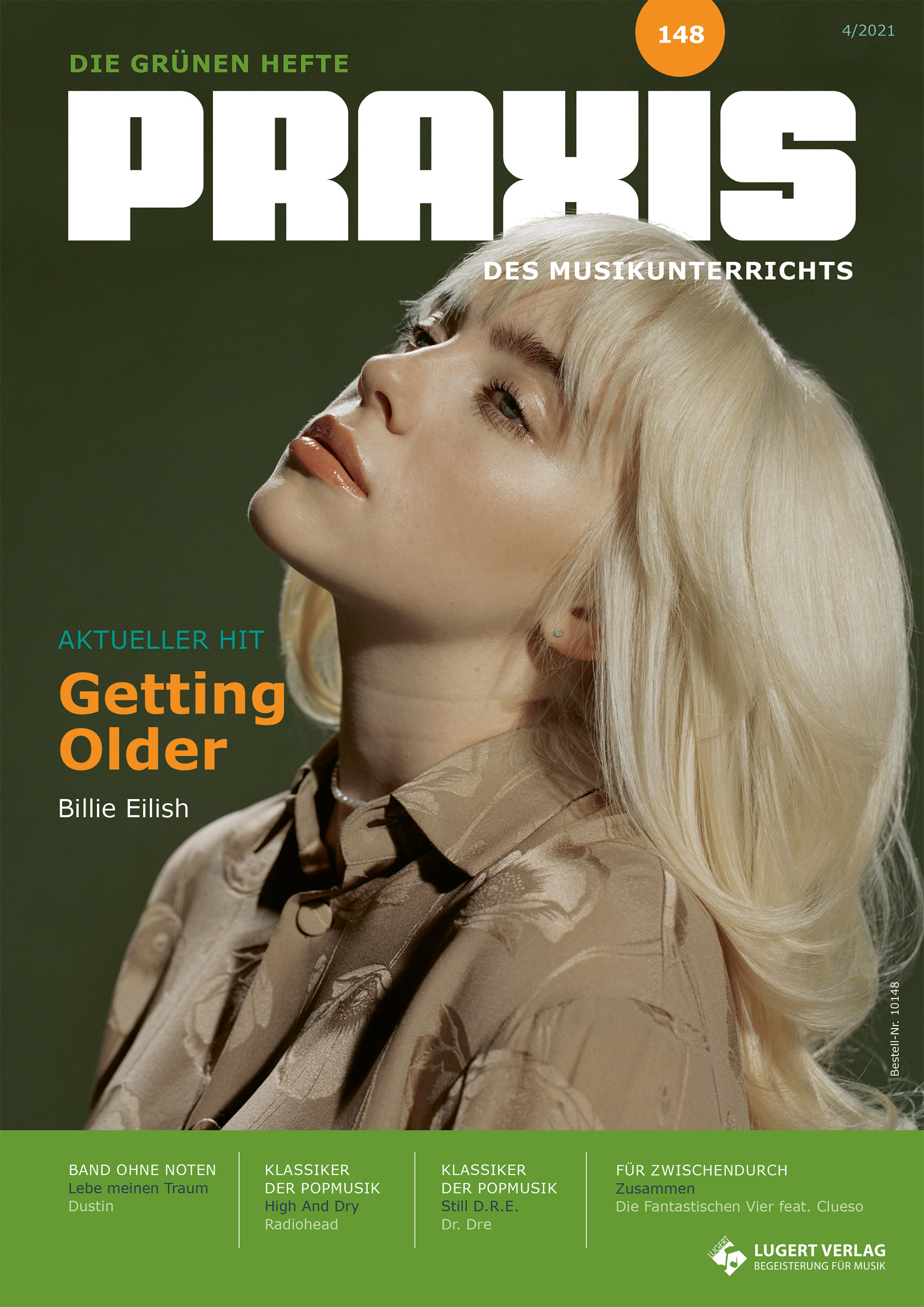 Der aktuelle Hit in der neuen Praxis des Musikunterrichts ist „Getting Older” von Billie Eilish. Ansonsten erwartet Sie im Teil Band ohne Noten „Lebe meinen Traum“ von Dennis und für Zwischendurch gibt es eine Bodypercussion mit Video-Tutorials zu „Zusammen” von Fanta 4 feat. Clueso.