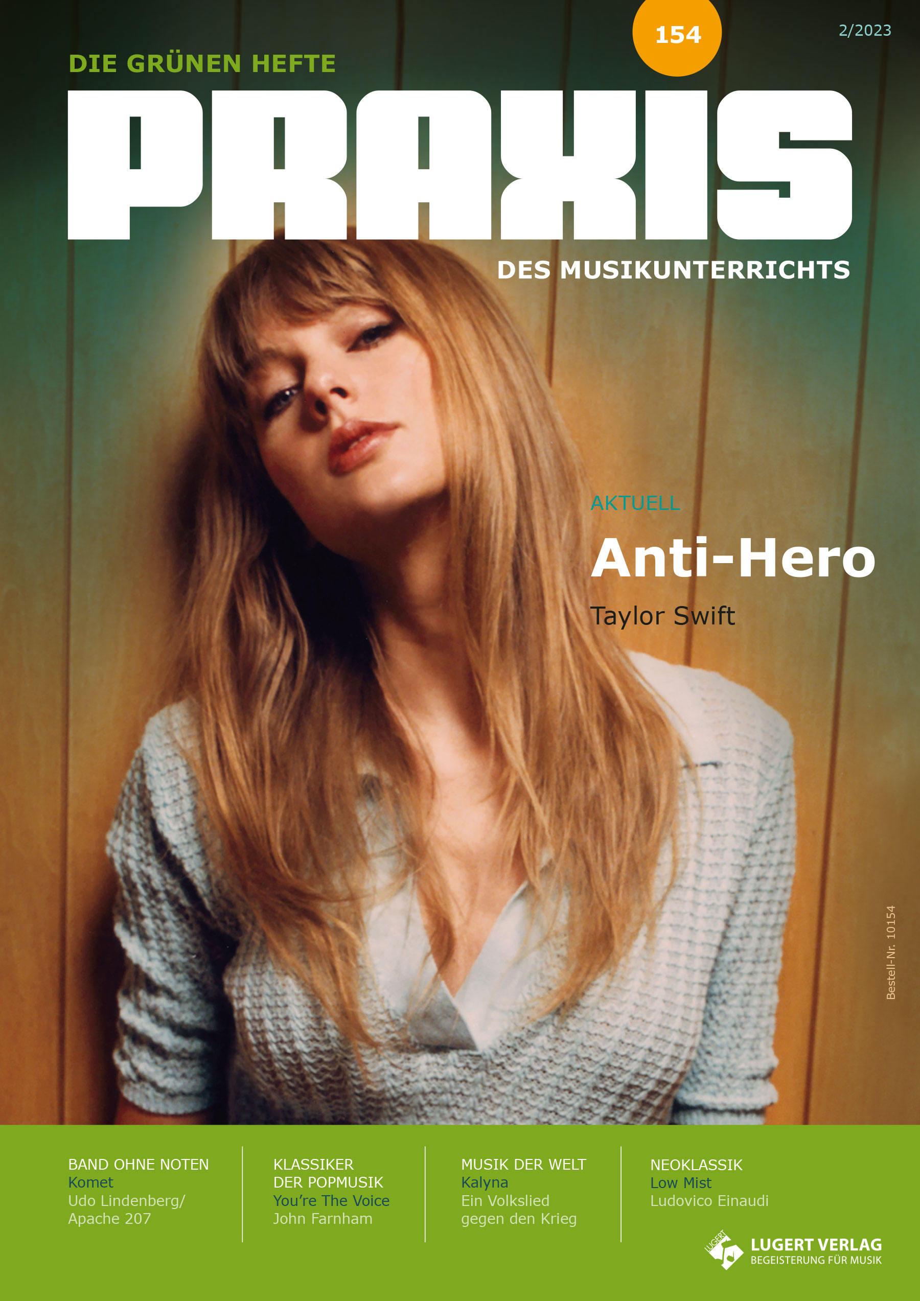 Der aktuelle Hit dieser Ausgabe ist „Anti-Hero” von Taylor Swift. Außerdem erwartet Sie mit dem Song „Komet” ein Band-ohne-Noten-Arrangement mit dem ersten Nummer 1-Hit von Udo Lindenberg , den er gemeinsam mit Superstar Apache 207 veröffentlicht hat. Außerdem gibt es einen Mitspielsatz zu „Flowers” von Miley Cyrus. Mit der Komposition „Low Mist” von Ludovico Einaudi wird ein Arrangement für das Musizieren im Musikunterricht vorgestellt. In der Rubrik Musik in der Werbung wird mit „You’re The Voice” ein alter 80er-Jahre-Hit genutzt, um die Haltung einer Firma zum Thema „Hass im Netz” aufzuzeigen.