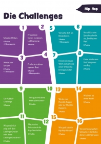 Mit diesen 16 Challenges können Sie Ihren Schüler*innen das Thema Hip-Hop spielerisch und schüler*innenzentriert (durch humorvolle, informative oder ernsthafte Darbietungen) näher bringen. Verschiedene Spielvarianten ermöglichen einen bunten, informativen und lockeren Einstieg ins Thema.Aufbau und Ablauf