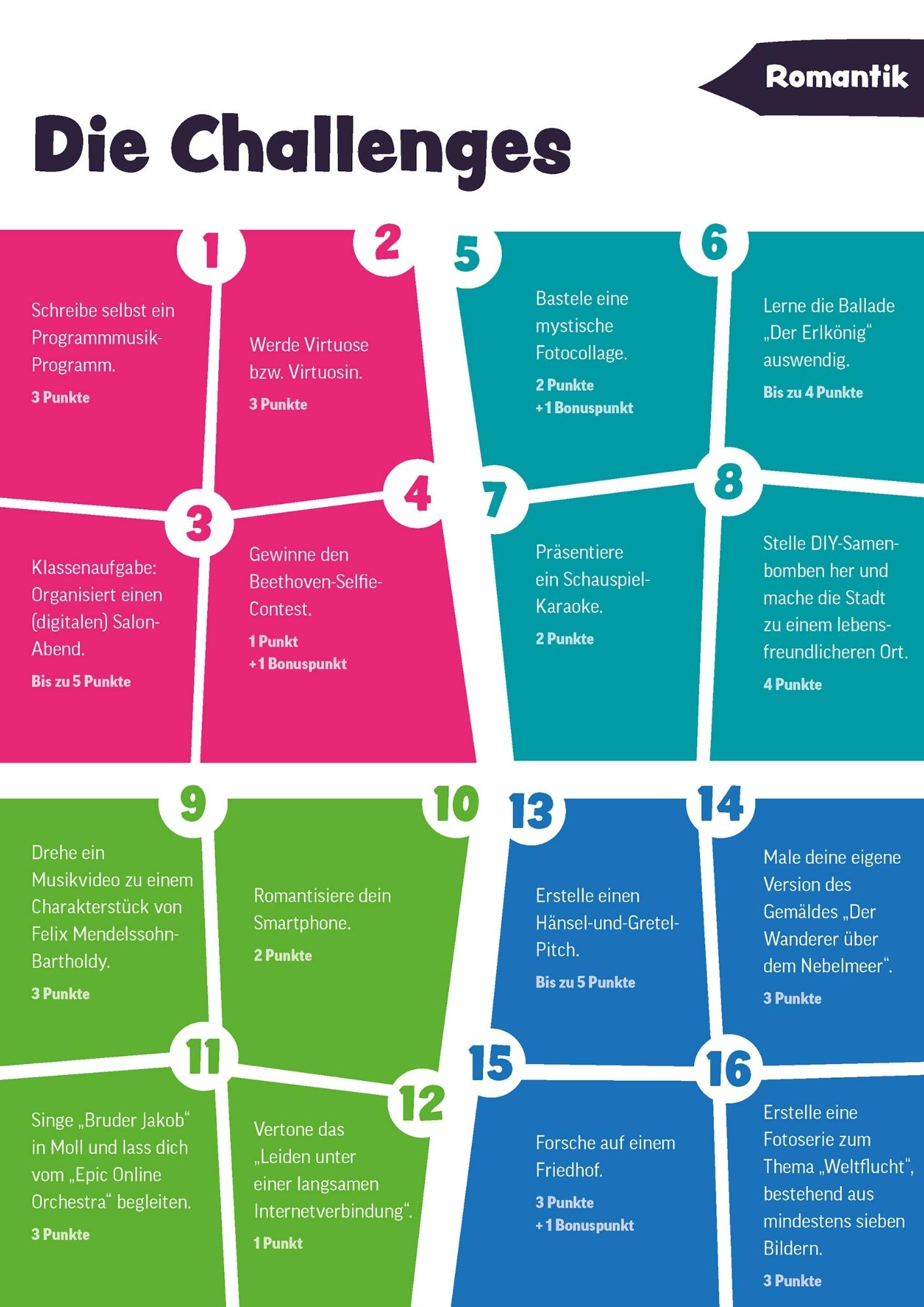 Mit diesen 16 Challenges können Sie Ihren Schüler*innen das Thema „Romantik“ spielerisch und schüler*innenzentriert (durch humorvolle, informative oder ernsthafte Darbietungen) näher bringen. Verschiedene Spielvarianten ermöglichen einen bunten, informativen und lockeren Einstieg ins Thema.