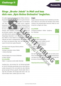 Gute und interessante Ideen (z.B. Challenge Nr.2 und 3) mit hilfreichen links und der Öffnung zu verschiedenen Themen. Mir persönlich fehlt allerdings die theoretische und (musik)geschichtliche Unterfütterung, für mich bleibt das Thema zu oberflächlich angerissen. Die Wortwahl "challenge" empfinde ich als sehr dem heutigen Zeitgeist hintergerannt. Alles in allem aber in Ordnung und als Ideenstifter geeignet.