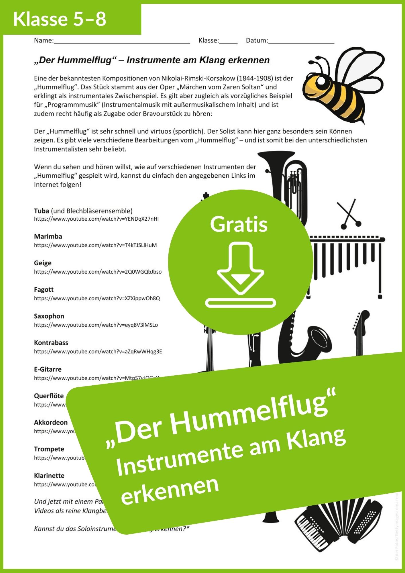 Mit diesem Arbeitsblatt zum „Hummelflug“ entdecken Ihre Schüler*innen verschiedene Soloinstrumente. Sie gehen auf Entdeckungsreise, schulen ihr Gehör für Klangfarben und erfahren gleichzeitig Spannendes über das Werk von Nikolai Rimski-Korsakow.Die YouTube-Links sind für Ihre Schüler*innen immer direkt unter dem Instrument zu finden. Auch Bilder der 11 Soloinstrumente sind auf dem Arbeitsblatt zur Erkennbarkeit enthalten.