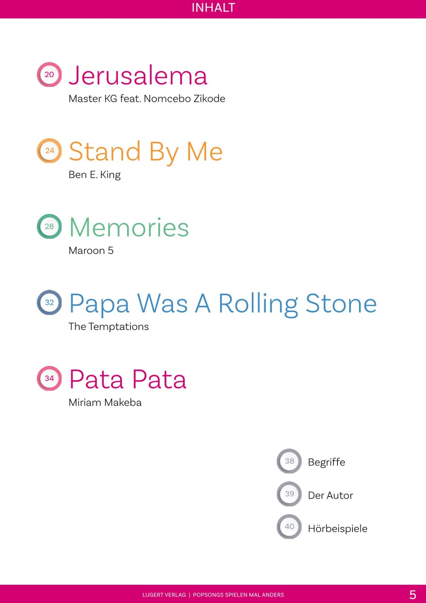 - alle Hörbeispiele: Original-Songs (über die Lugert Play App), die Patterns als Ganzes und im sukzessiven Aufbau.