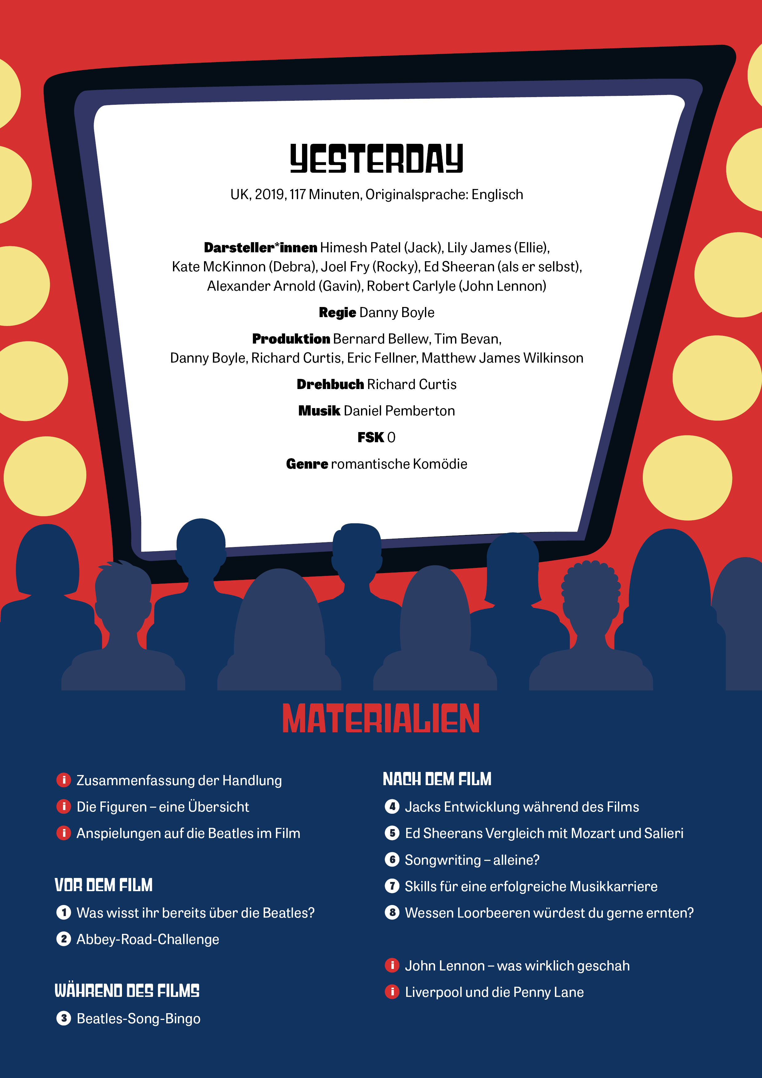 Lassen Sie Ihre Schüler*innen mit den enthaltenen Hintergrundinformationen, der Figurenübersicht, den Aufgaben und Challenges so richtig in die Handlung des Films eintauchen. Entdecken Sie gemeinsam flankierende Themen wie Musikbusiness und Songwriting sowie natürlich die Songs und Ereignisse im Leben der Beatles. Schaffen Sie ein schönes, gemeinsames Erlebnis mit Ihrer Klasse und dieser kurzweiligen Unterrichtseinheit, die Ihren Schüler*innen noch lange im Gedächtnis bleiben wird.
