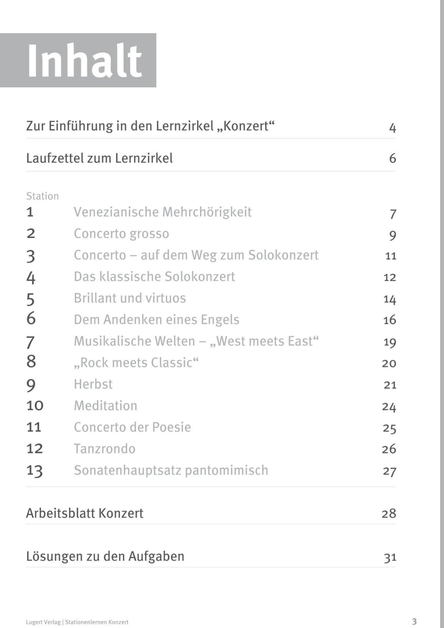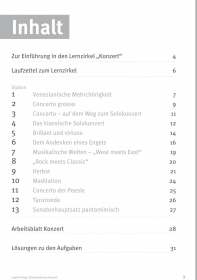 Die ersten 6 Stationen des Lernzirkels „Konzert“ beschäftigen sich mit der Entwicklungsgeschichte des Konzertes. An ausgesuchten Beispielen werden wichtige Stationen der Gattung wie Concerto grosso, Solokonzert und Virtuosenkonzert erläutert. Darüber hinaus stehen moderne Werke im Mittelpunkt, die eine Schnittstelle zwischen klassischer und Rockmusik bzw. zwischen europäischer und indischer Musik bilden. Weitere praktische Stationen bieten schließlich die Möglichkeit, mit dem erworbenen Wissen musikalisch, praktisch und motorisch zu experimentieren.