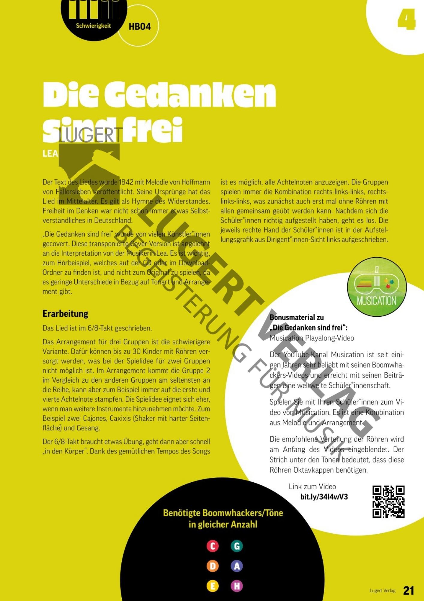 Mit dem Boomwhackers-Material erhalten Sie zudem Übungen, die das Gruppengefühl, das rhythmische Zusammenspiel und die Koordination fördern. Als Bonusmaterial haben wir zusammen mit dem Videoproduzenten Musication ein Playalong-Video für Sie erstellt.