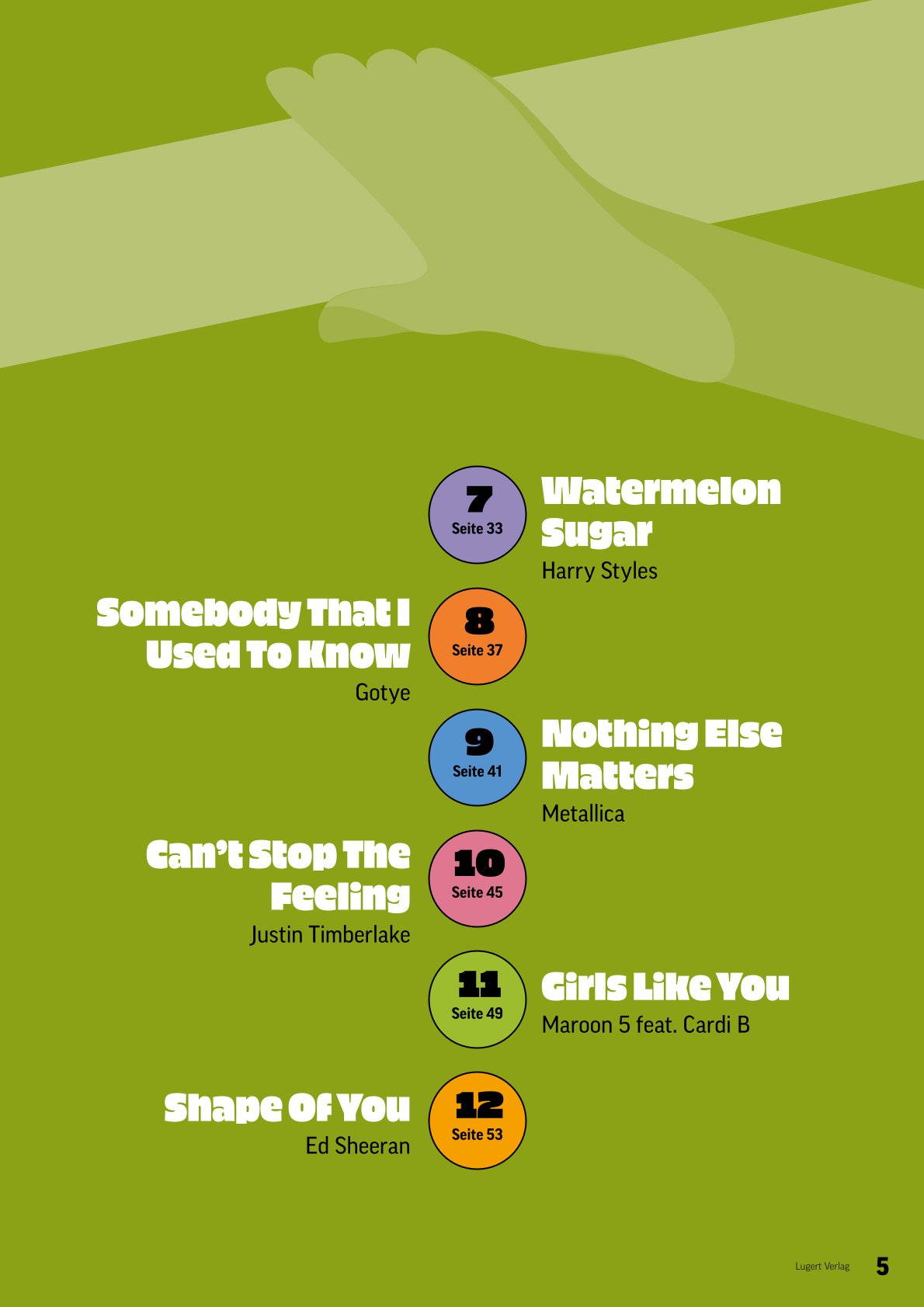 Überraschen Sie Ihre Unterstufenklasse mit beliebten Songs wie „Nothing Else Matters“, „Shape Of You“ und „Watermelon Sugar“, „Alles nur geklaut“ und „Girls Like You“ oder „Don’t Worry Be Happy“ und „Stand By Me“. (Alle Songs finden Sie auch unter dem Reiter „Inhaltsverzeichnis“.)