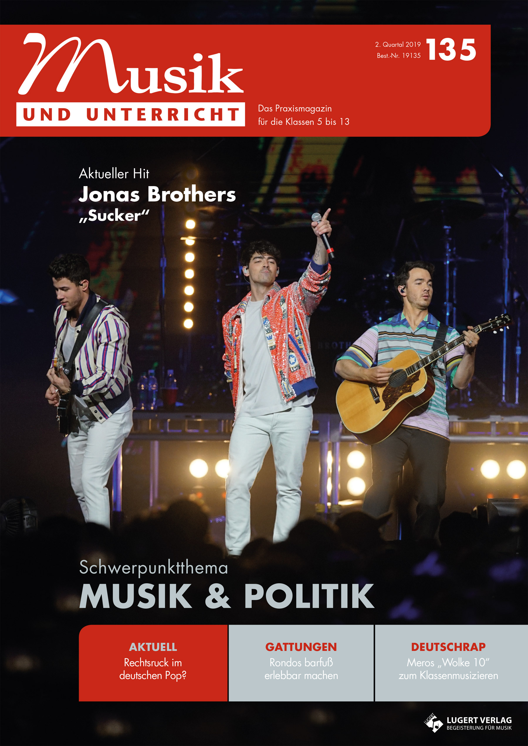 Schüler sind tagtäglich von Musik umgeben, deren Bedeutung weit mehr als musikimmanent ist. Aktuelle, kritisch zu hinterfragende politische Verhältnisse und die künstlerischen Reaktionen vieler Musiker machen die unterrichtspraktische Auseinandersetzung unverzichtbar. Deswegen legen wir mit den Schwerpunktartikeln in dieser Ausgabe das Augenmerk auf neue und bedeutende aktuelle Schnittstellen von Musik und Politik. Daneben bietet das Heft viele weitere Praxismaterialien: ein komplettes Arrangement zum Klassenmusizieren des aktuellen Hits „Sucker“, einen Grundlagenkurs für alle, die Smartphones gewinnbringend in den Musikunterricht einbinden wollen, ein frisches Konzept zur Vermittlung der Rondo-Form und mit Meros „Wolke 10“ endlich einen umsetzbaren Deutschrap-Titel.